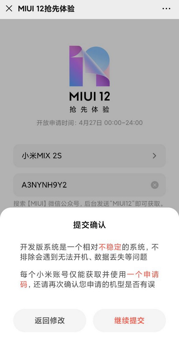 4 月 27 日,小米手机打开MIUI 12内侧报考申请办理,客户向微信公众平台MIUI推送「MIUI 12」获得申请办理码,在 申请办理网页页面 填好有关型号及申请办理码以后就可以进行申请办理。